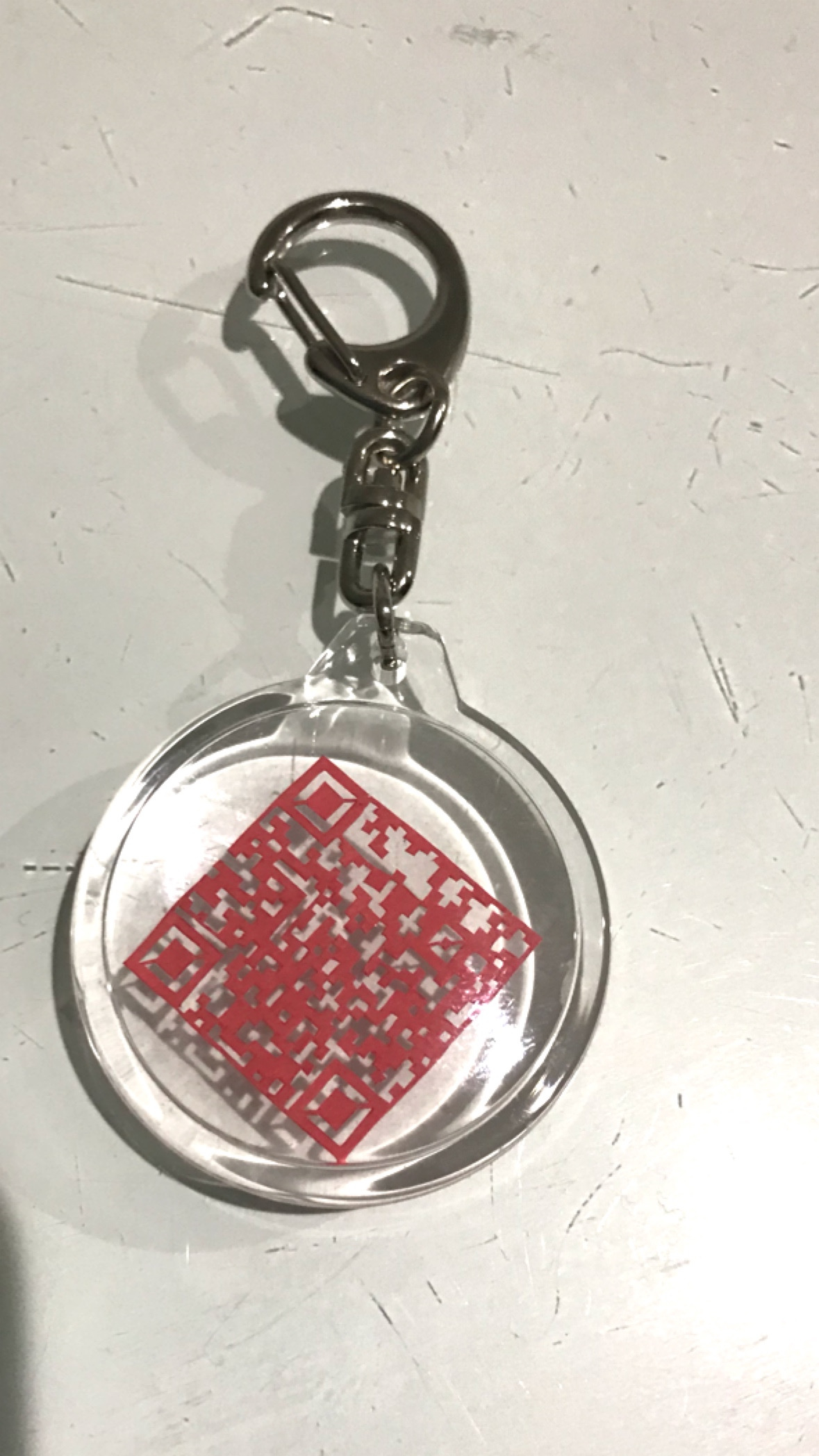 九の発想なんですがキーホルダー◯だと2,8cm □だと3cmのQRコードが出来たり