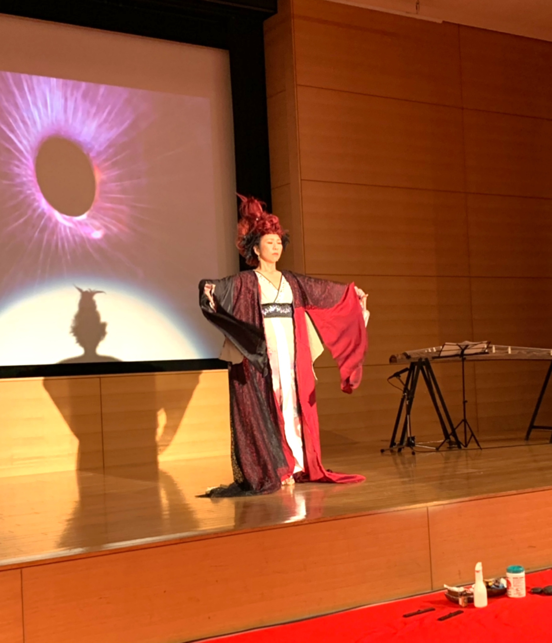瞑想の後はプロデューサーでありビジュアルヘアーアーティストのShuさんのライブパフォーマンスと、日幸 知さんが着物に赤龍🐉を書いていくパフォーマンス
