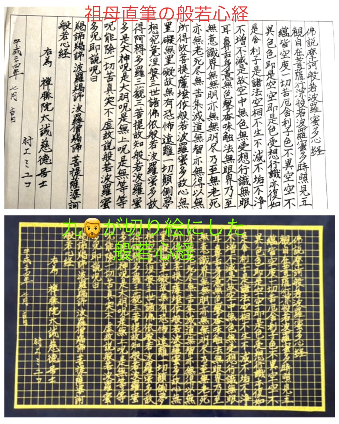 祖母の直筆の般若心経を切り絵にしたものを