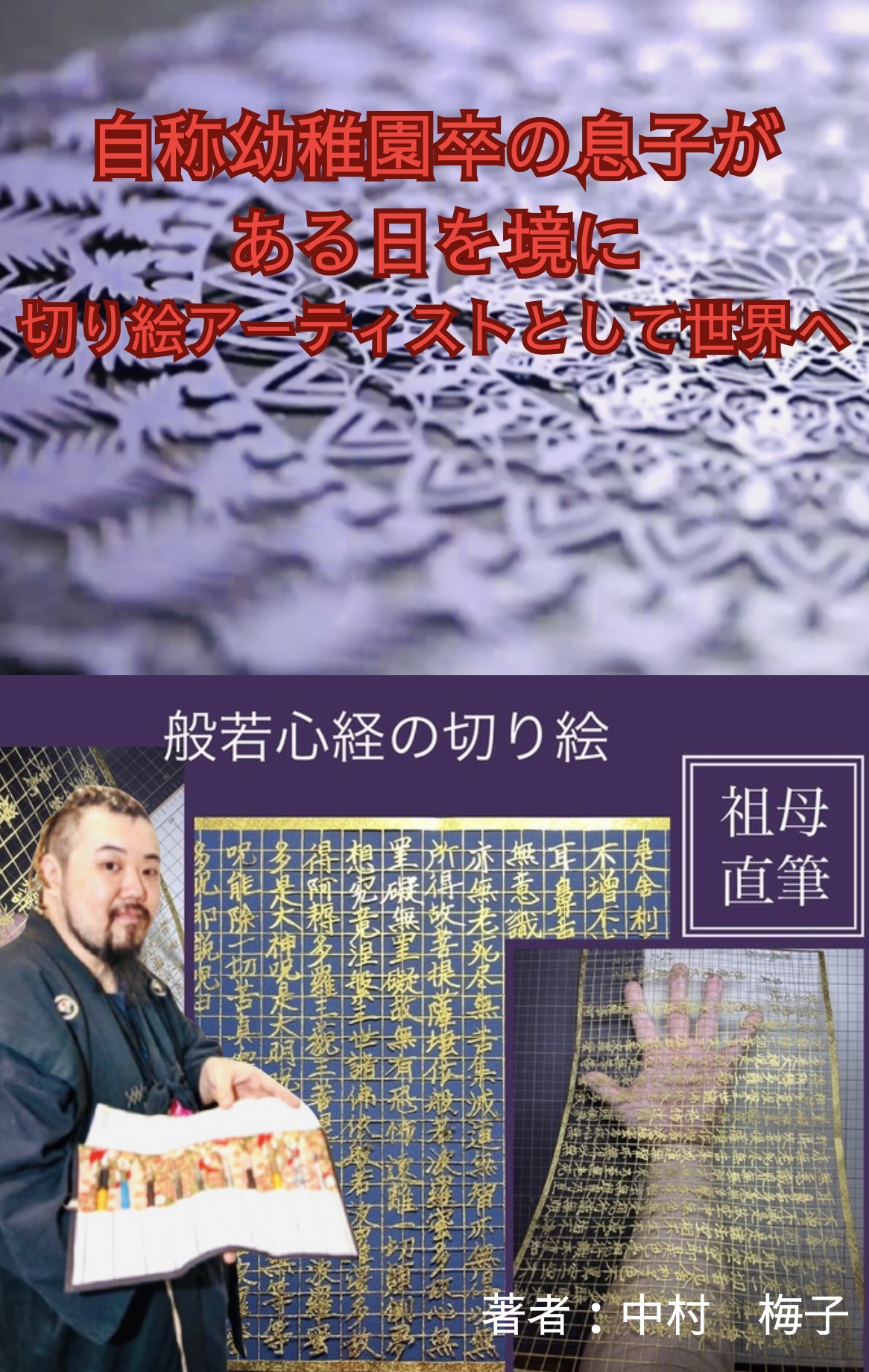 電子書籍の表紙は、祖母がきっかけで切り絵を始めたので、祖母直筆の般若心経を切り絵にした写真と、TV取材を受けたときの作品で表紙にしました。色あいが紫🟣で統一感がある気がしたので、Canvaで作りました‼️